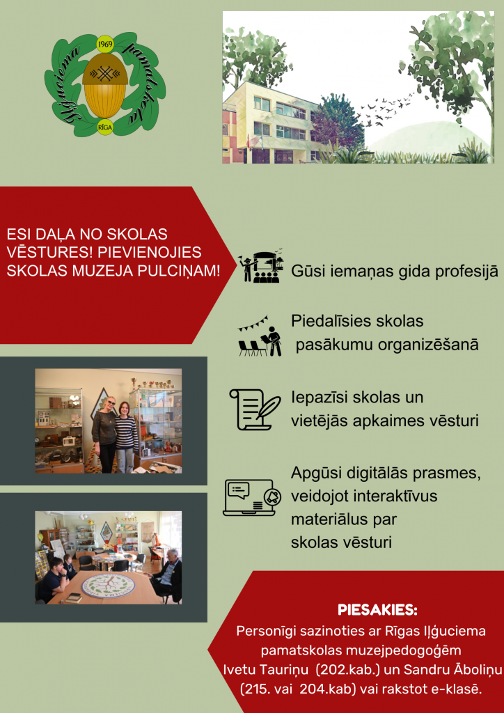 Skolas tradīciju kopšana: Tu piedalīsies skolas vērtību (atbildība, uzticība, radošums, tradīcijas) aktualizēšanā mūsdienīgā un interaktīvā veidā (veidojot digitālas izstādes, video stāstus u.c.)